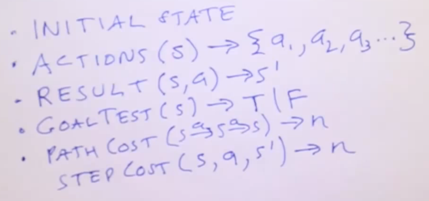 动作(s)->{a1, a2, a3...}输入一个状态,输出一个可能的动作集合结果(s, a)->s1输入一个状态和动作,输出新的状态。状态为出发地A,行动为驾驶,线路G107朝途径地B,然后在途径地B得到结果:新状态在途径地B。目标测试(s)->True|False测试状态是否为goal(目的地S),输入一个状态,输出True或False。路径成本(s->s->s)->n各个步骤成本的总和。步骤成本(s, a, s1)->n通过状态,动作以及动作产生的结果状态,输出数字n,是该步骤的成本。在示例中可能是公里数或到达目的地S的分钟数。![寻路问题]()